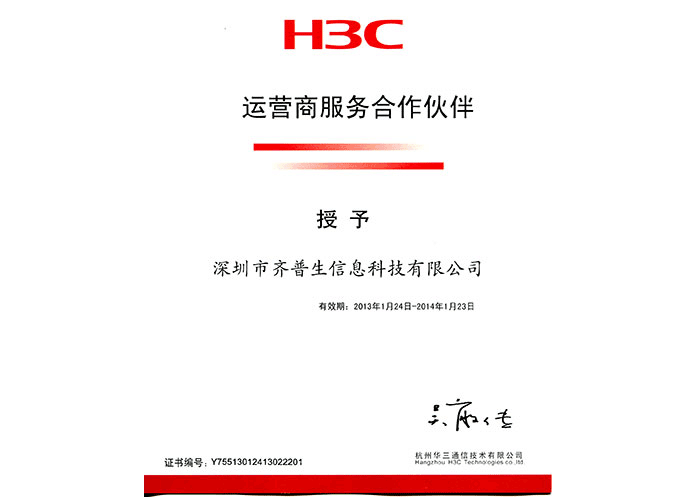 • H3C運營商服務合作伙伴證書