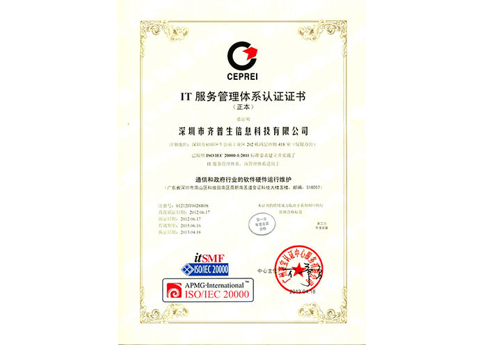 • ISO/IEC 20000 IT服務管理體系認證證書